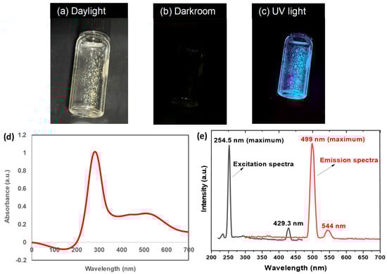 Optical and fluorescence analysis of PET-FCQDs: (a) under daylight, (b) darkroom, (c) fluorescence observed under UV illumination, (d) UV-Vis absorbance spectrum, and (e) maximum excitation and emission spectrum. All measurements were performed at room temperature.
