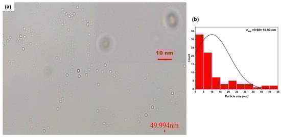 The size distribution of the PET-FCQDs, as shown in the histogram, reveals a predominant particle size range between 1 and 5 nm, which accounts for the majority of the quantum dots. This indicates that the PET-FCQDs synthesized through the green one-step method have achieved a uniform and ultra-small size, consistent with the desired properties for quantum dots. The distribution curve suggests a sharp decline in frequency for particles larger than 5 nm, with very few particles exceeding 10 nm in diameter. Smaller quantum dots are often associated with higher quantum yields and better optical properties, making this size range advantageous for fluorescence-based sensing applications [44,45]. However, the particle size generally ranged from 2 to 50 nm, with an average size of 9.98 ± 10.90 nm, suggesting a heterogeneous particle size distribution (Figure 3b). The tailing observed for larger particle sizes could be attributed to aggregation or incomplete fragmentation during the synthesis process. The rough surfaces and variable particle sizes may increase the available surface area, which could be advantageous for applications requiring surface interactions, such as sensing and adsorption.