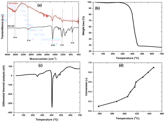 FTIR-ATR spectra (a), thermogram (b), differential thermal analysis (DTA) (c), and conversion factors (d) of PET-FCQDs from recycled PET plastic waste.