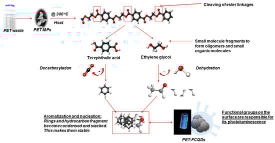 Recycling plastic waste by heating it breaks the carbon chains and reorganizes them into dots [48]. Broken and rearranged carbon chains will bind atoms like hydrogen (H), oxygen (O), and other functional groups. The ethanol utilized as dispersion polymer particles gives rise to the alcohol -OH group, as shown at a wavenumber of 3445 cm−1 (Figure 4a). In comparing the FTIR spectra of the synthesized PET-FCQDs with standard PET MPs spectra, several key functional groups, such as those from the original PET structure, may be missing or reduced due to chemical transformations during synthesis, typically involving carbonization and oxidation processes. The ester bond (O=C-O-C) is a defining feature of PET, with characteristic peaks around 1700–1710 cm−1 (carbonyl C=O stretch) and 1099 cm−1 (C-O stretch). During the high-temperature synthesis of PET-FCQDs, ester bonds are likely to break down first, resulting in the loss of some ester-related peaks and the formation leading to the release of small molecular fragments of terephthalic acid (C8H6O4) and ethylene glycol (C2H6O2) (Figure 5). This process converts ester groups into abundant C=O and -COOH (̴1650 to 1700 cm−1) and C-O (1300 cm−1) groups, which shift or alter the original ester peaks. This shift indicates a structural reorganization, and a broader, less distinct C=O peak may appear as a result. This is due to the degradation of ester linkages and subsequent decarboxylation reactions to other oxygen-containing groups (Figure 5). The C=O contributes to n-π* transitions, absorbing light in the UV region around 341 nm (Figure 2d) [49], while C-O bonds may contribute minimally to absorbance [39]. The C=O, COOH, and C-O functionalization also play a role in photoluminescence properties by creating additional electron acceptor sites, which facilitate the electron transitions and stabilize excited states responsible for photoluminescence under UV excitation [50,51]. In standard spectra, aliphatic -CH stretching vibrations are typically found around 2925 cm−1 and 2855 cm−1. These peaks were significantly reduced or absent in PET-FCQDs because the carbonization process can break down aliphatic chains, leading to the formation of a more aromatic structure. The absence or reduction in these peaks indicates a decrease in aliphatic hydrocarbon chains, contributing to a more rigid, carbon-rich structure. The aromatic C-H out-of-plane bending vibrations are seen around 700–900 cm−1 in raw PET material, but they were weakened in the PET-FCQDs, indicating that the synthesis process modifies or removes some of the aromatic rings. Although some aromaticity is typically retained, partial breakdown and rearrangement of the rings can lead to a decrease in these specific bending peaks [1]. The production mechanism of the PET-FCQDs is presented in Figure 5. The FTIR spectrum confirms the presence of functional groups that contribute to the UV absorbance characteristics of PET-FCQDs. Carbonyl and C-O groups play critical roles in defining the optical properties, as observed in the UV-Vis spectrum, by facilitating electronic transitions that lead to strong UV absorbance under UV illumination. These functional groups enhance the photophysical properties of PET-FCQDs, making them promising for applications requiring strong UV absorbance and visible fluorescence, such as sensing or bioimaging [52].