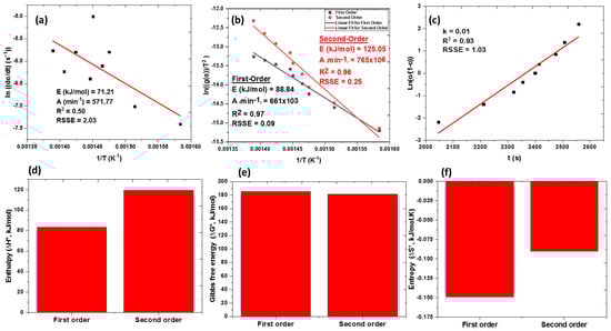 This study also utilized the Coats–Redfern (CR) method, a robust model-fitting approach designed to analyze reaction kinetics by fitting various models to reaction extent versus temperature curves. Through this method, both the activation energy and frequency factor can be determined simultaneously, as described by Coats and Redfern [25]. The approach simplifies the exponential integral using an asymptotic series expansion, as presented in Equation (15). To represent the function g(α), numerous reaction model approximations are documented in the literature [54,55]. For this research, the kinetic models for zero and first-order reactions were selected for analysis. The first-order model assumes that a single reaction pathway dominates, and that the reaction rate is temperature-dependent, while the zero-order model suggests that the decomposition rate is independent of the concentration of the reactant. Equations (16) and (17) approximate g(α) for zero and first-order reactions, respectively, and substituting these into Equation (13) yields Equations (18) and (19).
