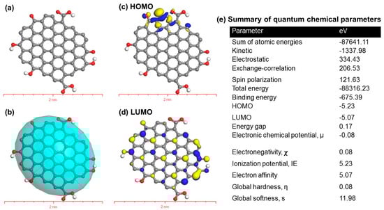 The geometry optimization process of the PET-CQDs identified the most energetically favorable molecular configuration by minimizing the interatomic forces on the potential energy surface [60]. Since it reflects the most stable and naturally occurring molecule configuration, this optimization is essential. The electronic structure calculations revealed key molecular orbital characteristics through HOMO (highest occupied molecular orbital) and LUMO (lowest unoccupied molecular orbital) analyses, which are visualized in Figure 7. The comprehensive quantum chemical parameters were determined, including total and binding energies, HOMO-LUMO energies and their gap (Egap), electronic chemical potential (μ), electronegativity (χ), ionization potential (IE), electron affinity (EA), and global reactivity descriptors (hardness η and softness S), as presented in Figure 7e. These parameters provide information on electronic behavior, chemical reactivity, and potential applications of PET-FCQDs.