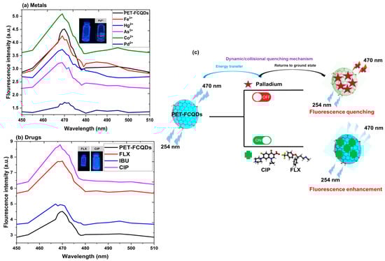 The sensing capabilities of PET-FCQDs were evaluated by monitoring their fluorescence emission at 254 nm after the addition of various metals (Fe3+, Hg2+, As3+, Co2+, and Pd2+) and drugs (ciprofloxacin (CIP), ibuprofen (IBU), and fluoxetine (FLX)) (Figure 8a,b). The results revealed that Pd caused a significant fluorescence quenching, reducing the emission intensity by 62%, while the introduction of CIP and FLX to PET-FCQDs led to notable fluorescence enhancements of 94% and 70.58%, respectively (Figure 4b). Other tested metals and drugs had negligible effects on the fluorescence spectra, highlighting the high selectivity of PET-FCQDs toward Pd2+, CIP, and FLX.