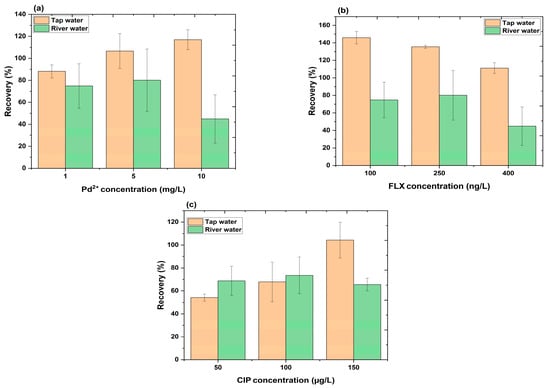 Recovery study of PET-FCQDs for (a) Pd2+, (b) FLX, and (c) CIP in the presence of real water samples (tap and river water).