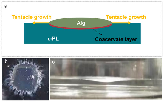 As shown in Figure 2a, when sodium alginate droplets (0.2 wt% SDS, 2 wt% Alg) come into contact with the surface of a ε-PL solution (1 wt%), they rapidly form droplets with tentacle-like structures around the perimeter within approximately 10 s (the case without surfactants is in Supporting Information Figure S3). These tentacles grow exclusively in the two-dimensional plane at the liquid surface (Figure 2b) and do not appear at any other spatial locations. The carboxyl groups of Alg and the amino groups of ε-PL can form a complex through electrostatic interactions, creating a cohesive barrier that prevents further diffusion of solutes. As a result, no tentacles are formed at locations above or below the liquid surface (Figure 2c).