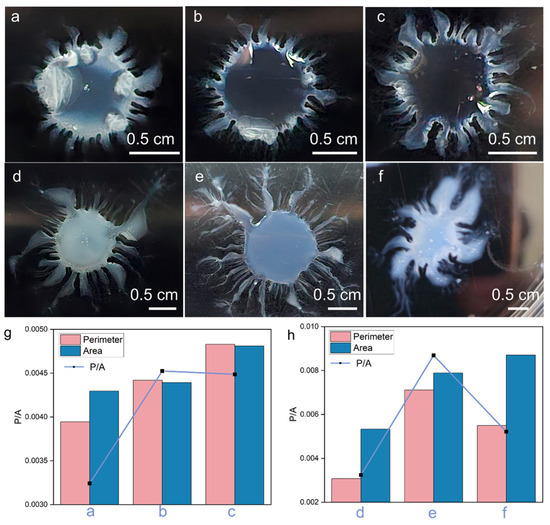 Photographs of biomimetic jellyfish-like droplets formed under different solution conditions: (a) 0.1 wt% SDS, 2 wt% Alg; (b) 0.2 wt% SDS, 2 wt% Alg; (c) 0.3 wt% SDS, 2 wt% Alg; (d) 0.2 wt% SDS, 1.5 wt% Alg; (e) 0.2 wt% SDS, 1.0 wt% Alg; (f) 0.2 wt% SDS, 0.5 wt% Alg. (g,h) Present the relative perimeter and area, as well as the perimeter-to-area ratio (P/A), calculated via image recognition for the droplets in (a–c) and (d–f), respectively.
