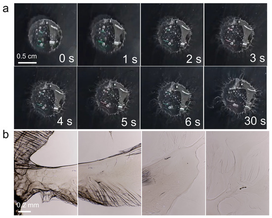 The tentacle formation process of the biomimetic jellyfish-like hydrogel. (a) Time-lapse images showing tentacle growth within 6 s after droplet deposition. (b) Microscopic images from tentacle root to tip (from left to right).