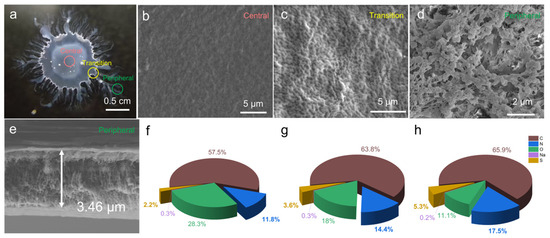 (a) An optical image of a biomimetic jellyfish-like droplet formed by depositing 0.2 wt% SDS and 1 wt% Alg into a 1 wt% ε-PL solution, with three distinct regions marked. (b–d) SEM images of the jellyfish-like droplet at different regions: (b) the central region, (c) the transition region, and (d) the peripheral region. (e) A cross-sectional SEM image of the tentacle edge. EDS point scanning results for elemental composition analysis of (f) the central region, (g) the transition region, and (h) the peripheral region, showing the distribution of C, N, O, Na, and S.