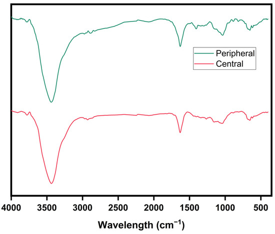 The FT-IR analysis shows peaks at 1407 cm−1 and 1630 cm−1 (carboxylate –COO− stretching from sodium alginate), 1036 cm−1 (S=O stretching from sulfate ester), and 1540 cm−1 (amide II band from N–H bending and C–N stretching). The 1540 cm−1 peak is notably stronger in the peripheral region than in the central region, consistent with EDS results, confirming the increased presence of ε-PL/SDS complexes at the periphery (Figure 6).