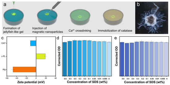 As all of the materials used are biocompatible, and the porous tentacle structure facilitates enzyme binding, the biomimetic jellyfish-like hydrogel is well-suited for enzyme immobilization in catalytic applications. The porous morphology increases the surface area and provides physical confinement for enzyme molecules (Figure S5). Meanwhile, potential weak interactions—such as hydrogen bonding, electrostatic attraction, or hydrophobic interactions—may also contribute to the immobilization. Given its high perimeter-to-area ratio, we selected 1 wt% Alg with 0.2 wt% SDS for hydrogel fabrication. As shown in Figure 7a, a droplet was first deposited onto a 1 wt% ε-PL solution to form a biomimetic jellyfish-like droplet. After stabilization for 10 min, 0.1 mL of 25 wt% Fe3O4 nanoparticle dispersion was added to the center, allowing the nanoparticles to uniformly sediment at the bottom, and they were then left undisturbed for another 10 min. The droplet was then transferred to 0.1 M CaCl2, inducing Alg crosslinking to encapsulate the Fe3O4 nanoparticles (10 min). After washing with deionized water, the hydrogel was immersed in 0.25 mg/mL catalase solution, gently stirred (5 h), and incubated (10 min) to allow enzyme attachment. The hydrogel was then washed and stored in PBS (Figure 7b). The immobilization likely involves a combination of physical entrapment facilitated by the hydrogel’s porous tentacle structure, as well as possible non-covalent interactions (hydrogen bonding, electrostatic or hydrophobic interactions), similar to mechanisms reported in previous studies [39,40]. Zeta potential measurements further support this interpretation, showing that catalase carries a net negative charge while ε-polylysine (ε-PL) is positively charged under experimental conditions, indicating that electrostatic attraction plays a key role in the enzyme attachment process [41,42]. As the tentacle regions of the hydrogel are enriched in ε-PL, these regions exhibit higher local loading as a result of enhanced electrostatic interaction. MTT assays confirmed the biocompatibility of the system. PBS solutions containing 1 wt% Alg with varying SDS concentrations (Figure 7c), as well as the biomimetic jellyfish-like hydrogels formed from them (Figure 7d), showed no significant changes in corrected OD values compared to the blank group, indicating no cytotoxicity [43,44].