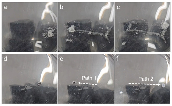 The motion states of the biomimetic jellyfish-like hydrogel at (a) 0 s, (b) 6 s, and (c) 12 s, respectively. (d–f) The motion states of the hydrogel without surfactant at (d) 0 s, (e) 3 s, and (f) 6 s, respectively.