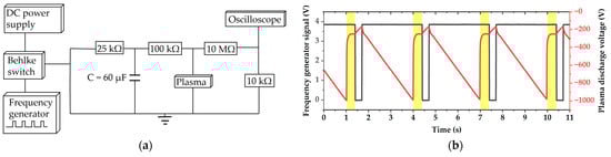Ultra-low duty cycle, pulsed sputter deposition is implemented at a working pressure of 7.4 × 10−3 mbar Ar, with a pulsing period of 3 s and a pulse width of 150 ± 10 ms, leading to an average power of 85 ± 10 W per pulse. The power within one pulse was calculated by measuring the voltage drop during the plasma discharge and the ignition time (compare Figure 1b). A schematic circuit diagram for the pulsed magnetron is shown in Figure 1a. The low repetition rates, as well as the low duty cycle, allow for controlled film growth and no temperature change during the pulsed deposition, starting at room temperature. In pulsed mode, the reported deposition time refers to the total duration of the deposition process, including both plasma “on” and “off” periods. The duty cycle defines the relative plasma-on time, which is below 10%.