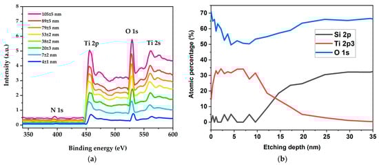 However, as can be seen in the exemplary depth profile in Figure 2b, the oxygen concentration in all samples shows an initial decrease with the etching depth, followed by a leveling to almost constant values before the concentration rises again together with the onset of silicon, both being predominant in the borosilicate substrates. The initial decrease in the O 1s signal can be attributed to the uppermost titanium dioxide layers formed through atmospheric oxidation, while the leveled region may be due to the aforementioned reasons.