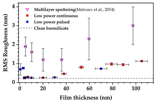 Root mean square surface roughness as a function of film thickness obtained in low-power sputtering in continuous (red squares) and pulsed mode (blue circles) in comparison with other experimental data [35] in the same layer thickness regime. The dashed horizontal line indicates the surface roughness Sq = 0.22 ± 0.02 nm of the borosilicate substrate used herein.