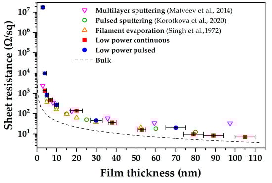 The sheet resistance at room temperature of the Ti films deposited by continuous and ultra-low duty cycle pulsed magnetron sputter deposition is compared to values reported in the literature in Figure 6. Similar to what others observe [8,17,22], it is impossible to approach the calculated electrical resistivity of Ti bulk extrapolated for thin film thicknesses. This effect can be attributed to deviations in the films’ structures from bulk material and chemical bonding of the residual gas, contaminating the pure Ti films during deposition.
