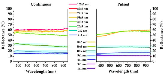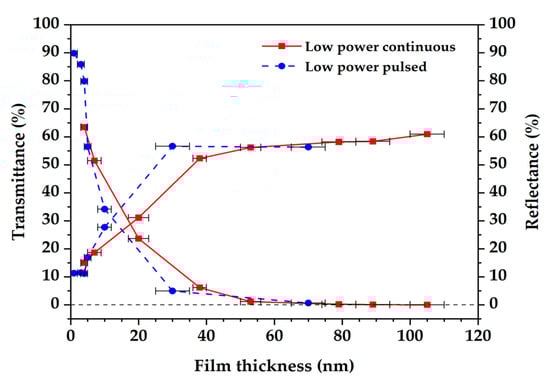 Reflectance spectra for the films deposited via continuous and pulsed magnetron sputtering are presented in Figure 7. The films considered in this study show a relatively uniform absorbance and reflectance in the visible region of the light spectrum. In contrast, an increase in the reflectance with increasing wavelengths has been reported for higher-power magnetron deposition [28,30].