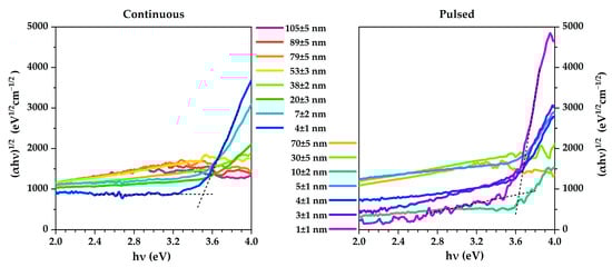 with d denoting the film thickness in cm, T the transmittance, and R the reflection of the corresponding sample, allows for the presentation of the data in a Tauc plot [54], as shown in Figure 9. In the case of the thinnest films, where the uppermost oxidized layer is not negligible in the overall film thickness, it is possible to observe a distinct absorption band in the Tauc plots. Consequently, a linear increase in the spectroscopic data can be observed due to absorptions above the bandgap energy. As this is only the case for materials with semi-conductive properties, the disappearance of the absorption edge indicates the increasingly metallic character of the respective film. In the continuously deposited films, the absorption band disappears at around 38 nm, while for the pulsed sputtered films, the metallic character already prevails at a film thickness above 30 nm.