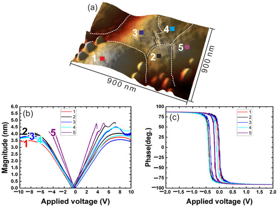 Figure 4 presents the local piezoelectric hysteresis loops for the 0% PVP sample. Figure 4a illustrates the scanned area, where different colors indicate contact regions between the probe and the surface of the structure. To ensure experimental accuracy, various grains were selected, with their boundaries marked by white dashed lines. Figure 4b,c depict the piezoelectric deformation (magnitude) response and phase switching as functions of the applied electric field, respectively. While the signal measured in magnitude of hysteresis loops is driven by the thin film-associated electromechanical response, the phase represents the switching behavior of the film. The colors of the curves correspond to the colored squares in the topography image. The results indicate that the dense 0% PVP sample exhibits piezoelectric responses that are consistent within the measurement uncertainty, suggesting that the material properties remain uniform across different grains. This confirms the expected homogeneity of the dense structure, where the absence of pores minimizes local variations in electromechanical behavior.