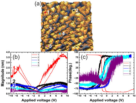 Local hysteresis loops analysis for the 0% PVP sample, (a) topography of the selected region, where colored squares indicate the probe’s contact points on the surface, (b) magnitude and (c) phase responses of the PFM signal.