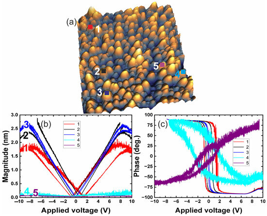 In Figure 5a, the surface is composed of multiple grains, indicating a significant structural transformation compared to the dense 0% PVP sample. These changes in microstructure also introduce distortions in the piezoelectric response dependencies, as observed in Figure 5b,c. Notably, the phase signal hysteresis loop at Point 1 (red line) exhibits a directional change compared to other measurements on this sample, suggesting local variations in ferroelectric behavior. Furthermore, the cantilever deflection due to piezoelectric deformation at Point 1 reaches 3 nm, the highest recorded value, whereas in other cases, the deflection remains below 1 nm.