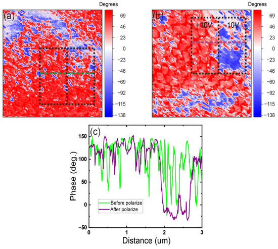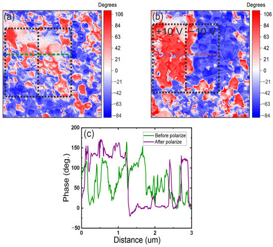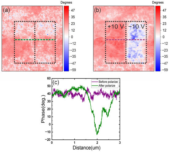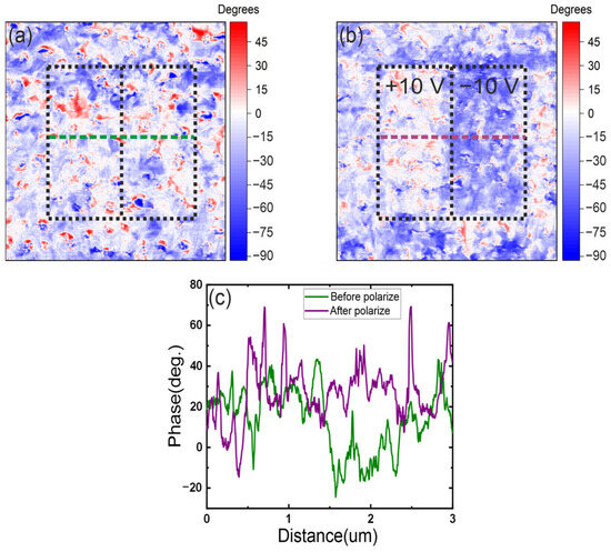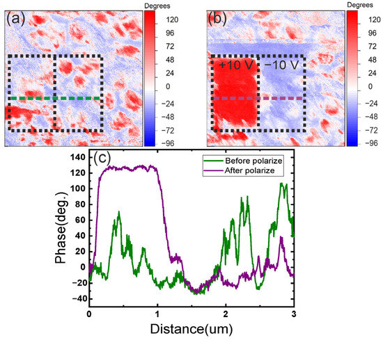 Cross-section and scanning results of the 3 × 3 mkm polymer-free sample (10 layers of PZT, thickness 370 nm, 0% porosity), (a) polarization contrast before repolarization, showing the initial distribution of spontaneous polarization, (b) polarization contrast after repolarization, illustrating the effect of charge lithography on the ferroelectric domain structure, (c) cross-section along the scan width, highlighting polarization variations before and after repolarization.