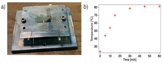 (a) Photograph of the modified sample holder showing the thin plate mounted on top of the previous sample holder; (b) evolution of the temperature on the sample holder (thin plate) while depositing at 16 kV and 80 Hz.