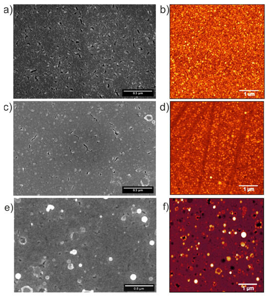 The bare Pt substrate in Figure 2a exhibits a rough surface morphology with uniformly distributed cracks with lengths in the order of 10s of µm. The AFM image in Figure 2b reveals that the Pt substrate has a surface roughness (root mean square, RMS) of ~5.5 nm. After 3 min of MoS2 deposition (as-deposited interface film in Figure 2c), it becomes obvious that the number of cracks and the overall roughness is slightly reduced due to the filling with MoS2. This agrees with the reduced RMS of ~4.7 nm, as measured from the AFM image in Figure 2d. After 120 min of deposition, the multilayer film exhibits the characteristic morphology previously reported in [15,17]—a smooth MoS2 thin film surface decorated with micron-sized, round-shaped particulates (droplets). These features are commonly observed in ablation-based deposition techniques and are attributed to the ejection of molten droplets or larger particulates from the target material [20].