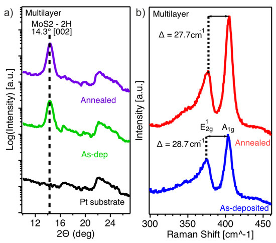 The crystallinity of the material further improves upon annealing as evidenced by XRD measurements (Figure 3a). The characteristic peak at 14°, corresponding to the (002) plane of the 2H-MoS2 phase, further sharpens and slightly increases in intensity upon annealing.