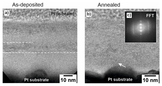 (a,b) HRTEM images of the (a) as-deposited and (b) annealed multilayer film with the corresponding Fast Fourier Transform (FFT) pattern in the inset (c).