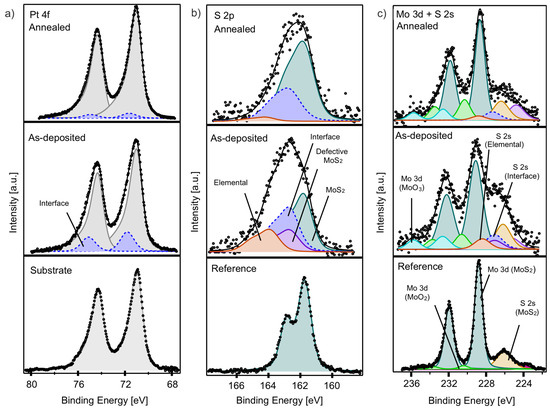 (a) Pt 4f, (b) S 2p, and (c) Mo 3d and S 2s core level spectra of as-deposited (middle panels) and annealed interface film (upper panels); the lower panels show corresponding reference spectra of bare Pt substrate and bulk MoS2, respectively.