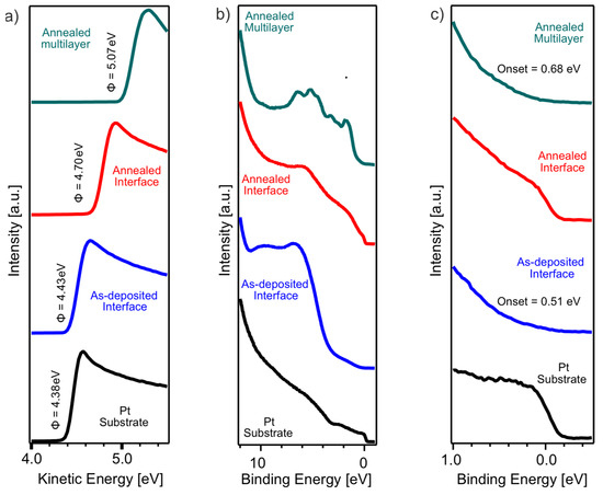(a) SECO and (b,c) valence band region UPS spectra of as-deposited and annealed interface film, annealed multilayer film, and Pt substrate, as indicated in the figure. (b) Extended region of the valence band spectra and (c) subsequent zoom into the near EF region.