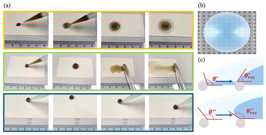 (a) Spreading behavior of GO droplets on hydrophilic (orange), hydrophobic (green), and superhydrophobic (blue) fibrous membranes. (b) Contact between the droplet and the fibrous membrane. (c) Receding behavior of the droplet on hydrophobic (top) and superhydrophobic (bottom) fibrous membranes.