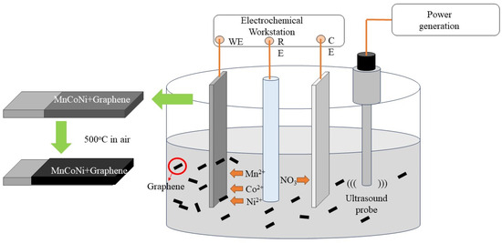 Furthermore, carbon-based materials such as graphene, graphene nanoplatelets, and carbon nanotubes (CNTs) are commonly incorporated with transition metal oxides (TMOs) to enhance electrode performance, owing to their excellent electrical conductivity and large specific surface area [11]. Electrodeposition synthesis stands out among the various methods used to create binder-free electrodes due to its ability to ensure a uniform distribution of catalysts and consistent grain sizes throughout the electrode’s surface, enhancing both performance and reliability [12]. A notable innovation in this study is the integration of ultrasonic assistance into the electrodeposition process for fabricating manganese–nickel–cobalt oxide with graphene (G@MNCO) composite electrodes. Unlike conventional electrodeposition, which often suffers from limited ion dispersion and non-uniform film growth, the application of ultrasonic waves promotes cavitation, enhances mass transport, and improves the homogeneity of metal ion distribution during film formation [13]. These effects lead to better control over the microstructure, adhesion, and porosity of the deposited layers. Ultrasonic-assisted electrodeposition has been reported to significantly improve properties such as mechanical strength [11], corrosion resistance [13,14], magnetic response [15], and hardness [16] in composite films.