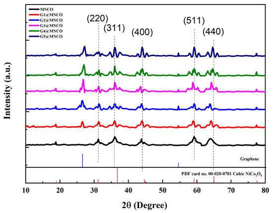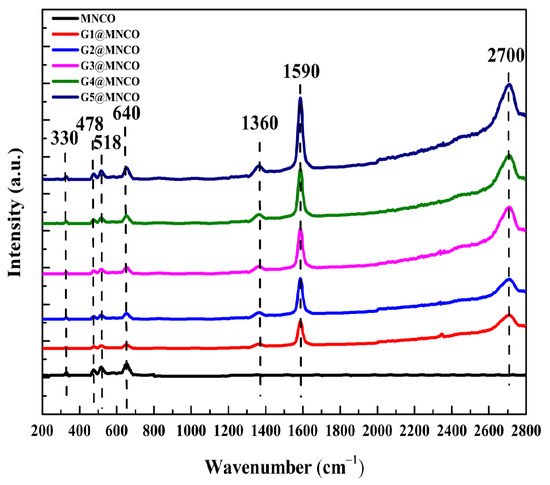 The X-ray diffraction (XRD) patterns of the G@MNCO electrodes with varying graphene contents are presented in Figure 2. All samples exhibited diffraction peaks corresponding to the spinel NiCo2O4 phase, consistent with the standard pattern (PDF card no. 00-020-0781). Characteristic reflections at the (220), (311), (400), (511), and (440) planes confirmed the successful formation of the crystalline NiCo2O4 structure. Importantly, as the amount of graphene in the G@MNCO electrodes increased, there was a significant enhancement in the intensity of the graphene peaks. The high-valence ion in the main crystal structure was occupied by low valence, leading to a shortage of oxygen ions. The main reason for this is that the number of introduced oxygen ions is lower than the number of cations in the main crystalline structure, causing the oxygen ratio to decrease. The conductivity properties of the oxide solid solution’s intermediate layer will be improved by generating oxygen vacancies in the structure to satisfy the relationship between position and electrical neutrality [16]. Figure 3 shows the Raman spectra of MNCO and G@MNCO. The observed Raman peaks at 330, 478, 515, and 640 cm−1 corresponded to the characteristic peaks of NiCo2O4. No additional phases or impurities were detected. With the increasing graphene content in the G@MNCO electrodes, the intensity of the graphene-related peaks at 1360, 1590, and 2700 cm−1 also increased.