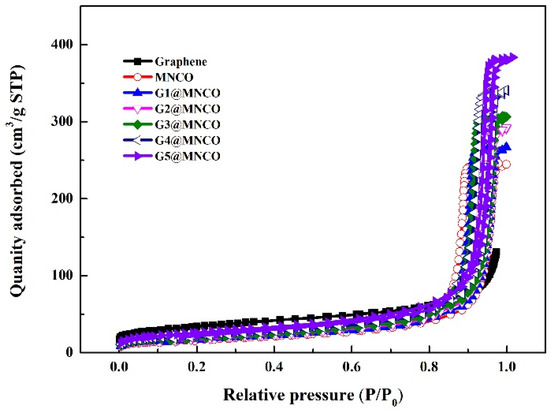Hysteresis loop of MNCO and G@MNCO electrodes between N2 adsorption and desorption isotherms.