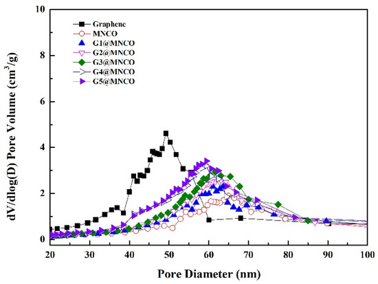 Pore size distribution of MNCO and G@MNCO electrodes.