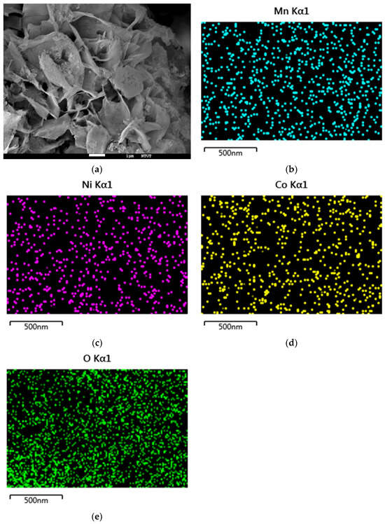 (a) the surface morphology of the G5@MNCO electrode. SEM elemental mapping images of the G5@MNCO electrode showing the uniform distribution of (b) Mn, (c) Ni, (d) Co, and (e) O elements.