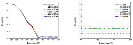 The TGA results for the G@MNCO electrodes are presented in Figure 9, showing that the Mn, Ni, and Co materials were completely oxidized at 600 °C. Between 600 °C and 1000 °C, only graphene remained in the sample. From sample MNCO to G5@MNCO, the residual materials after 1000 °C were 0%, 1%, 2%, 3%, 4%, and 5%, respectively. This indicates the presence of graphene in the material in the anticipated proportions.
