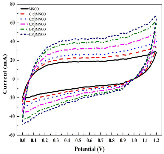 According to Table 5, the G5@MNCO electrode exhibited the highest specific capacitance (202 F/g), the lowest intrinsic resistance (0.55 Ω), and the best capacitance retention (95%) after 10,000 cycles. This enhancement is attributed to the synergistic effect arising from three key features: (1) the nanostructured Mn–Ni–Co oxide matrix, (2) the conductive graphene network, and (3) the direct binder-free growth on Cu foam via ultrasonic-assisted electrodeposition. This combination promotes robust interfacial integration, which significantly improves structural stability and minimizes interfacial charge resistance. Graphene serves as a highly conductive scaffold that enhances electron mobility and provides additional ion-accessible surface area, while Cu foam offers mechanical support and a 3D conductive backbone that reduces overall charge transfer resistance. Furthermore, the enhanced performance is closely related to the formation of oxygen vacancies within the G@MNCO framework. These vacancies, induced during the ultrasonic-assisted deposition process, act as active defect sites that facilitate redox reactions and improve electronic conductivity by introducing localized energy levels near the Fermi level [29,30,31,32]. The presence of oxygen vacancies also promotes greater adsorption and transport of electrolyte ions, contributing to higher charge storage capability [33]. Thus, the improved electrochemical behavior of G5@MNCO is a result of this multi-component synergy, where oxygen vacancies, graphene integration, and conformal electrodeposition on Cu foam collectively enable efficient charge transport, rapid ion diffusion, and stable cycling performance. To further evaluate the practical electrochemical performance, CV measurements of all samples were conducted using a two-electrode configuration at a scan rate of 5 mV/s, as shown in Figure 15. All G@MNCO-based electrodes exhibit quasi-rectangular CV curves, indicating good capacitive behavior and reversible charge–discharge processes in a symmetric device setup.