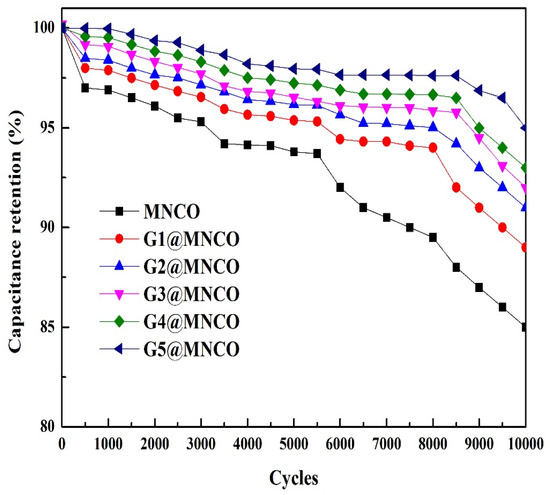 where (F/g) represents the specific capacitance, (g) is the mass of the active electrode material, n (mV s−1) is the scan rate, denotes the potential window, and (mA) is the current response obtained from the cyclic voltammetry curves. Figure 10 displays the cyclic voltammetry (CV) curves of the samples, demonstrating that increasing the graphene content resulted in a noticeable enlargement of the CV curve area, thereby indicating an improvement in specific capacitance. As summarized in Figure 10, the specific capacitance values for the MNCO to G5@MNCO samples were 310, 352, 400, 431, 451, and 475 F/g, respectively. For Mn, the typical redox reaction involves the transition between Mn(III) and Mn(IV) oxidation states during cycling, which contributes to the pseudocapacitance behavior [21]. Similarly, Ni and Co undergo redox reactions at the electrode surface, with Ni(II)/Ni(III) and Co(II)/Co(III) redox couples, which enhance the charge storage capacity [22,23]. The increase in graphene content in the G@MNCO electrodes facilitates improved conductivity and faster ion diffusion, which, in turn, enhances the Faradaic reactions, further boosting the specific capacitance [24]. Figure 11 illustrates the high-frequency region of the electrochemical impedance spectroscopy (EIS) spectra. The intersection point on the real axis (x-axis) represents the ohmic resistance (Rs), which includes the internal resistance of the electrolyte, the contact resistance at the electrode–electrolyte interface, and the intrinsic resistance of the electrode material. The estimated Rs values for the sample electrodes were 0.82, 0.72, 0.69, 0.64, 0.61, and 0.55 Ω, showing a decreasing trend with increasing graphene content. In the medium-to-high frequency range, the diameter of the semicircular arc corresponds to the charge transfer resistance (Rct, where a smaller arc radius indicates lower faradaic resistance at the interface. At low frequencies, the impedance curves display a linear tail, indicative of Warburg impedance (Ws), which is associated with the diffusion of ions from the electrolyte into the electrode. Notably, the G5@MNCO electrode exhibits a steeper Warburg slope, suggesting reduced ion diffusion resistance, likely due to the improved conductivity and ion transport pathways facilitated by the higher graphene content [25,26,27]. Figure 12 depicts the capacitance retention performance tested over 10,000 times under a 1 A g−1 current density. As shown in Figure 10, the retention rates for MNCO through the G5@MNCO samples were 85%, 89%, 91%, 92%, 93%, and 95%, demonstrating a progressive improvement in capacitance stability with increasing graphene incorporation. According to Figure 13, the G5@MNCO sample had the longest discharge time among all the samples. This improvement can be primarily attributed to the strong interfacial interaction between MNCO and graphene, which enhances structural stability, electronic conductivity, and ion diffusion efficiency [28].