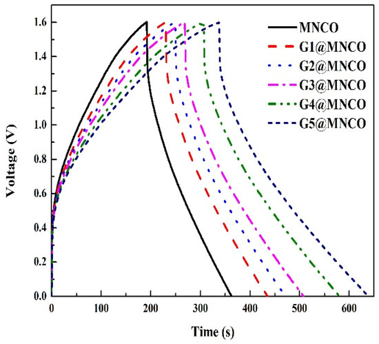 3.4. Electrochemical Performance of G@MNCO Electrodes