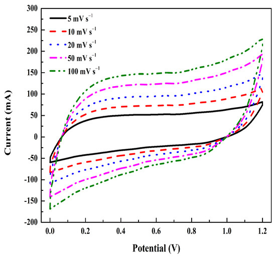 Figure 14 presents the cyclic voltammetry (CV) profiles of the G5@MNCO electrode at various scan rates ranging from 5 to 100 mV/s, measured using a three-electrode configuration. As the scan rate increased, the current response also increased, indicating excellent supercapacitive behavior. Notably, the CV curves retained a quasi-rectangular shape across all scan rates, suggesting fast and reversible redox reactions. This behavior implies that the capacitance of the electrodeposited G5@MNCO electrode arises not only from electric double-layer formation but also from pseudocapacitive contributions, differentiating it from typical EDLCs that exhibit nearly ideal rectangular CV profiles.