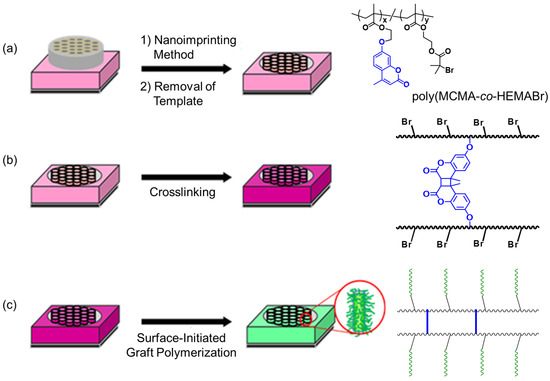 Preparation of a polymer thin film with designed hierarchically ordered surface structure by a combination of nanoimprinting and controlled polymerization. (a) Preparation of poly(MCMA-co-HEMABr) films with pillar structures on their surfaces. (b) Fixation of the pillar structure by photocrosslinking. (c) Surface-initiated graft polymerization from the crosslinked pillar films.