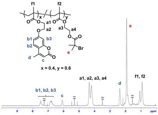 For the preparation of polymer thin films with hierarchically ordered surface structure, we designed a new copolymer (poly{[2-(4-methyl-2-oxo-2H-chromen-7-yloxy)ethyl methacrylate]-co-[2-(2-bromo-2-methylpropionyloxy)ethyl methacrylate]}; poly(MCMA-co-HEMABr)) with coumarin moieties and α-haloester moieties. The synthesis of methacrylate monomers with coumarin moieties (MCMA) was carried out by the condensation of methacryloyl chloride with a coumarin derivative according to a previous report [26]. And the synthesis of methacrylate monomers with α-haloester moieties (HEMABr) was carried out by the condensation of 2-hydroxyethyl methacrylate with 2-bromoisobutyryl bromide according to a previous report [27]. MCMA and HEMABr were copolymerized using AIBN in 1,2-dichloroethane at 60 °C for 4 h ([MCMA]0/[HEMABr]0/[AIBN]0 = 45/55/1, [MCMA]0 + [HEMABr]0 = 25 wt%). The obtained 1,2-dichloroethane solution of the reaction mixture was poured into a large amount of MeOH to remove the unreacted monomers and precipitate the polymer. The obtained polymer was characterized by 1H NMR and size exclusion chromatography (SEC). Figure 2 shows the 1H NMR spectrum of the isolated copolymer (Mn = 150,000; Mw/Mn = 2.89). 1H NMR analysis of poly(MCMA-co-HEMABr) showed a series of characteristic resonances, including those of the MCMA moieties (peaks b at δ = 6.5–7.0 ppm and δ = 7.4–7.7 ppm, peak c at δ = 6.1 ppm, and peak d at δ = 2.4 ppm), the HEMABr moieties (peak e at δ = 1.9 ppm), and the MMA main chain protons (peaks f at δ = 0.8–1.4 ppm). The integration ratio of the characteristic signals (peaks b, c, d, and e in Figure 2) supported the formation of a copolymer of MCMA and HEMABr with a composition ratio of 40:60. The synthesized poly(MCMA-co-HEMABr) had both crosslinkable sites (coumarin moieties) and polymerization initiation sites (α-haloester moieties) and was used to produce a thin film with vertically aligned pillars on its surface.