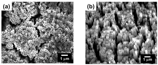 Since temperature setting is important in hot-press nanoimprinting, the glass transition temperature of the obtained poly(MCMA-co-HEMABr) was examined by differential scanning calorimetry (DSC) before nanoimprinting and found to be 75 °C (heating rate; 10 °C/min). (Figure S1). Therefore, the set temperature for hot-press nanoimprinting was 130 °C, which is sufficiently higher than the glass transition temperature of the same bath copolymer. A 1,2-dichloroethane solution of the copolymer was then spin-cast (1200 rpm, 20 s) onto a Si wafer pretreated with 3-aminopropyltrimethoxysilane to produce a thin film. This pretreatment was performed to improve the interaction between the copolymer and the Si wafer, thereby preventing the copolymer thin film from peeling off under SI-ATRP conditions. The spin-coated film showed uniform coloring due to structural coloring, suggesting a constant film thickness. Furthermore, the thickness of the resulting film was measured at five points using contact probe analysis, which also indicated a uniform film thickness at approximately 1400 nm. The obtained polymer film was nanoimprinted using an AAO as a template at 130 °C for 3 min under 20 bar. The formation of pillar structures is determined by the combination of temperature and pressure. In this experiment, the pressure was fixed at 20 bar based on preliminary considerations, and the formation behavior of pillar structures was examined by changing the temperature. When the temperature was increased to 140 °C, which is above 130 °C, it was observed that the length of the formed pillars increased, but some defects existed in the pillar structure. On the other hand, when the temperature was reduced to 120 °C and 110 °C, the length of the formed pillars decreased. Furthermore, at 100 °C, the template was not transferred to the polymer film. The AAO template was removed by etching with 1 molL−1 NaOH aqueous solution. After washing with water and drying, the surface morphology of the polymer film was observed by SEM (Figure 3a). Vertically aligned pillar structures with a diameter of 260 ± 30 nm and a length of 1000 ± 200 nm were observed, confirming that the fine pore structure of the AAO used as a template had been transferred to the polymer film surface. As shown in Figure 4a, no Al peaks were observed in the XPS analysis of the pillar film surface after the AAO was removed by dissolving, confirming the complete removal of the AAO. Furthermore, no traces of undissolved AAO were observed in the SEM observation of the resulting pillar film.