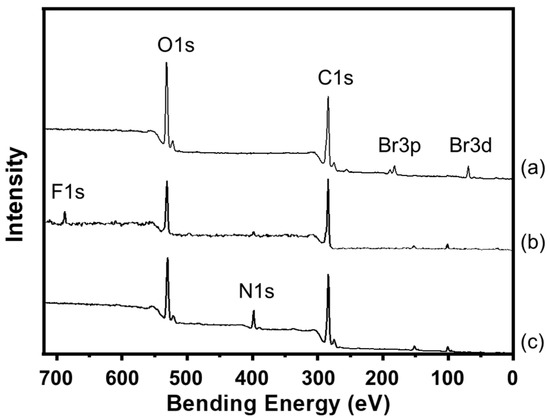 XPS spectra of the surfaces of the (a) CL-poly(MCMA-co-HEMA-Br) pillar film, (b) CL-poly((MCMA-co-HEMABr)-g-poly(TFEMA)) pillar film and (c) CL-poly((MCMA-co-HEMABr)-g-poly(NIPAM)) pillar film.