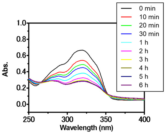 Next, the pillar structure was fixed by photocrosslinking inside each pillar. As shown in Figure 5, UV absorption spectroscopy confirmed that the photochemical dimerization of the pendant coumarin moieties in the copolymer film proceeded in the solid state. Upon irradiation with UV light (150 W high-pressure mercury lamp; λ = 365 nm), the intensity of the absorption band originating from the coumarin groups at 280–350 nm gradually decreased [24,28]. The reaction rate of the coumarin moiety was calculated from the decrease in the peak intensity (absorbance at 320 nm) of the UV-vis spectra in Figure 4. Consequently, the reaction rate of the coumarin moiety was estimated to be approximately 80%. The photodimerization of the coumarin moieties occurred both intramolecularly and intermolecularly, the latter contributing to the fixation of the pillar structure. When the surface morphology of a film sample (crosslinked poly(MCMA-co-HEMABr); CL-poly(MCMA-co-HEMABr)) obtained by the photodimerization of the coumarin pendants was observed by SEM, it was confirmed that the aligned individual pillar structures were maintained and their size was almost unchanged (Figure 3b) compared to those in the SEM image before photoirradiation (Figure 3a). When the light irradiation time was 1 to 3 h, the polymer pillar structure could not be maintained and partially dissolved. Furthermore, the crosslinked pillar film was insoluble even when immersed in 1,2-dichloroethane, a good solvent for the starting copolymer, suggesting that the fixation of the pillar structure was achieved by the formation of crosslinks inside the pillars.