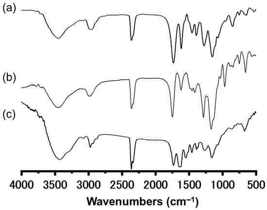 IR spectra obtained for the (a) CL-poly(MCMA-co-HEMA-Br) pillar film, (b) CL-poly((MCMA-co-HEMABr)-g-poly(TFEMA)) pillar film, and (c) CL-poly((MCMA-co-HEMABr)-g-poly(NIPAM)) pillar film.