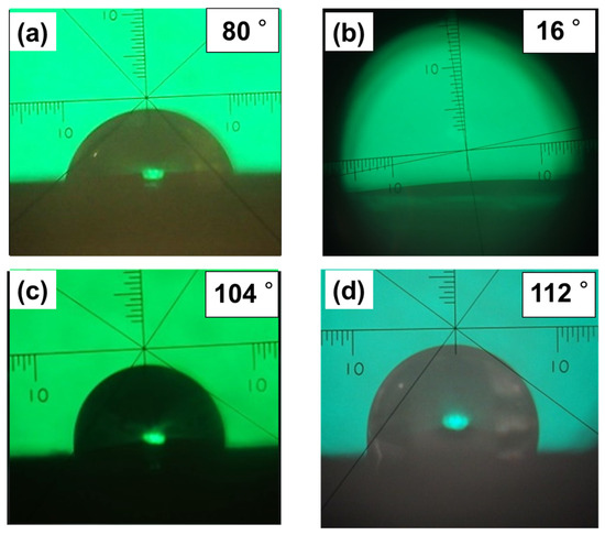 In order to ascertain the effect of the pillar structure on the interfacial properties of the film surface (especially the gas-phase interface), a flat film prepared by spin-coating was used as a control sample, and a comparative study was conducted focusing on wettability, which is one of the evaluation indices for interfacial activity. First, to clarify the change in surface properties caused by the formation of the pillar structure, a comparative analysis of the static water contact angles of the flat film and the pillar film was conducted. The contact angles were measured to be 80° for the flat film and 16° for the columnar film (Figure 8a,b), which was probably due to the capillary action induced by the pillared structure of the surface, as shown in Figure 3b, rather than an increase in hydrophilicity due to increased surface roughness based on the pillar structure (Wenzel’s theory). Since poly(TFEMA) is hydrophobic [30], the wettability of the surface was reduced by grafting a fluoropolymer onto the film surface. The static contact angle of a water droplet on the flat film surface grafted with poly(TFEMA) was 104° (Figure 8c), whereas the value was 112° on the pillar film surface grafted with poly(TFEMA) (Figure 8d), both of which were significantly more hydrophobic than the sample before grafting. It is noteworthy here that the difference in wettability of the pillar film before and after grafting with poly(TFEMA) was significantly large, and the sample grafted with poly(TFEMA) retained its pillared structure (Figure 6b) but no longer showed the capillary effect and became highly water-repellent.