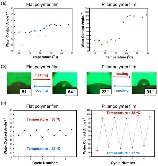 Poly(NIPAM), a representative thermoresponsive polymer, changes its conformation and hydrophilicity/hydrophobicity in response to temperature changes in an aqueous environment. That is, below the phase transition temperature (Tpt) of about 32 °C, it forms an extended conformation due to hydration and becomes hydrophilic, and when the temperature rises above Tpt, it dehydrates and assumes a collapsed conformation and becomes hydrophobic. Furthermore, this hydrophilic/hydrophobic switching due to the phase transition is reversible with temperature changes [31,32]. When poly(NIPAM) is fixed to a material surface, the change in the properties of the polymer chain determines the surface properties, and the interfacial properties (hydrophilicity/hydrophobicity) of the material surface can be controlled by changing the temperature [33]. A limited number of reports have demonstrated that the introduction of nanoscale roughness onto a surface by grafting can have a significant effect on the wettability of the surface [23,34]. Therefore, it is interesting to investigate the effect of poly(NIPAM)-grafted pillar surfaces on interfacial properties, such as wettability. Figure 9a shows the static contact angle of a water droplet on the surface of the poly(NIPAM)-grafted flat film and pillar film as a function of temperature. For both sample surfaces, an increase in the water contact angle was observed between 31 °C and 35 °C during the heating process, and it was found that this temperature-responsive change in wettability was significantly amplified by the presence of the pillar structure. As shown in Figure 9b, when the temperature was increased from 22 °C to 38 °C, the water contact angle of the poly(NIPAM)-grafted flat film increased by only 13°, whereas the water contact angle of the poly(NIPAM)-grafted pillar film increased significantly to 68°. This improvement in wettability due to the temperature response of poly(NIPAM) chains is consistent with another report [23,34]. Furthermore, when the temperature was repeatedly increased and decreased in the range from 22 °C to 38 °C, the water contact angles of both sample surfaces changed reversibly, with the amplitude of change being significantly larger for the grafted pillar film. In addition, the amplitude of the water contact angle was maintained within the range of the number of trials in this experiment, indicating that the hydrophilic/hydrophobic switching of the sample surface could be reversibly controlled without attenuation (Figure 9c). These results indicate that the functionality of the film surface was amplified by the synergistic effect between the surface morphology of the pillar structures (primary structure) and the chemical properties of the grafted polymer chains (secondary structure) introduced onto the surface.